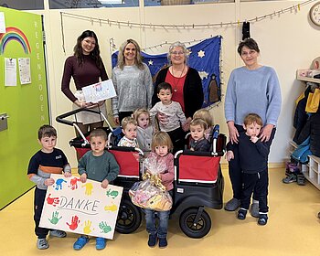 Die Kinder der Kleinkindgruppe freuen sich über einen neuen Krippenwagen von der Gerhard-Winker-Stiftung.