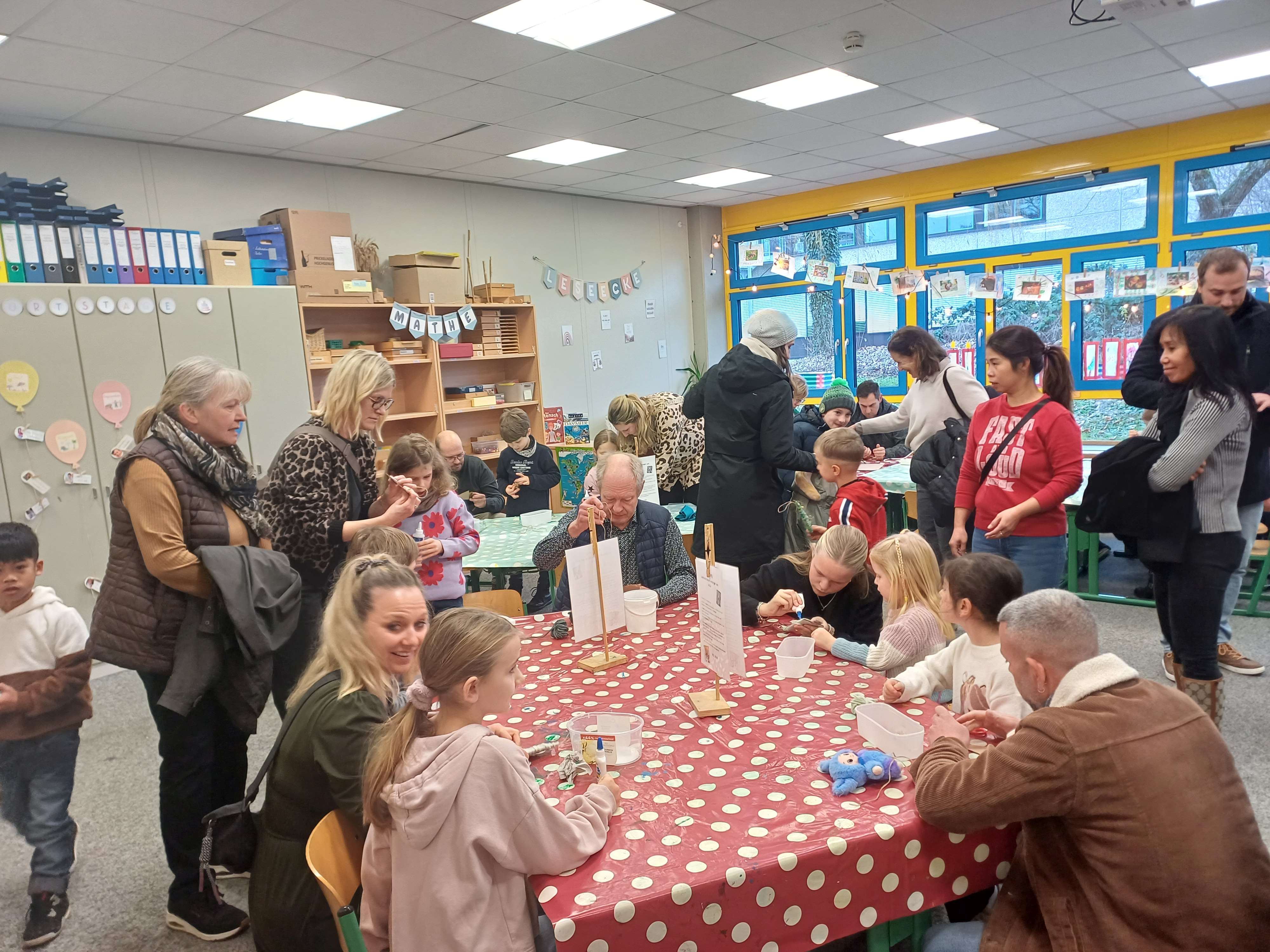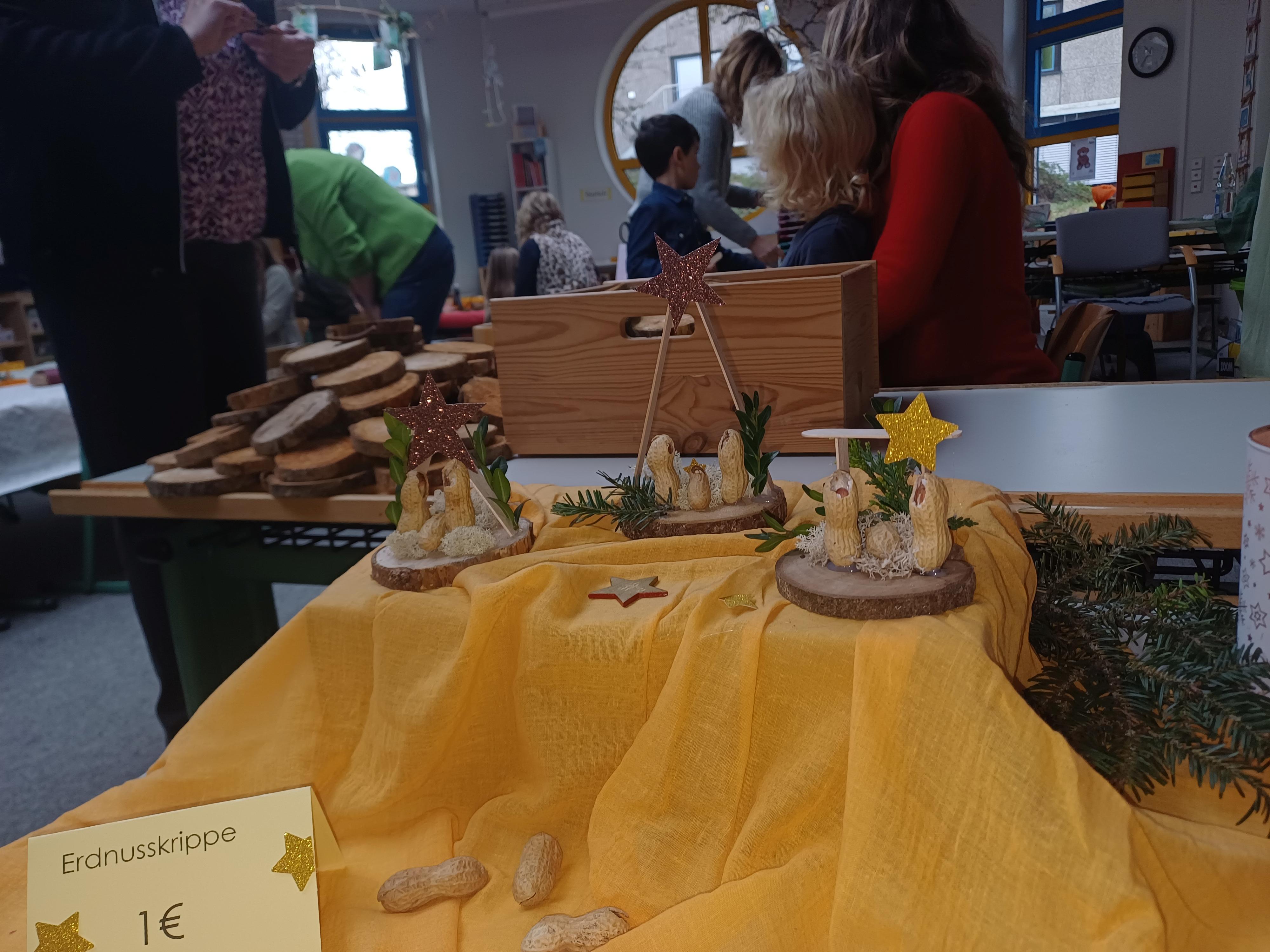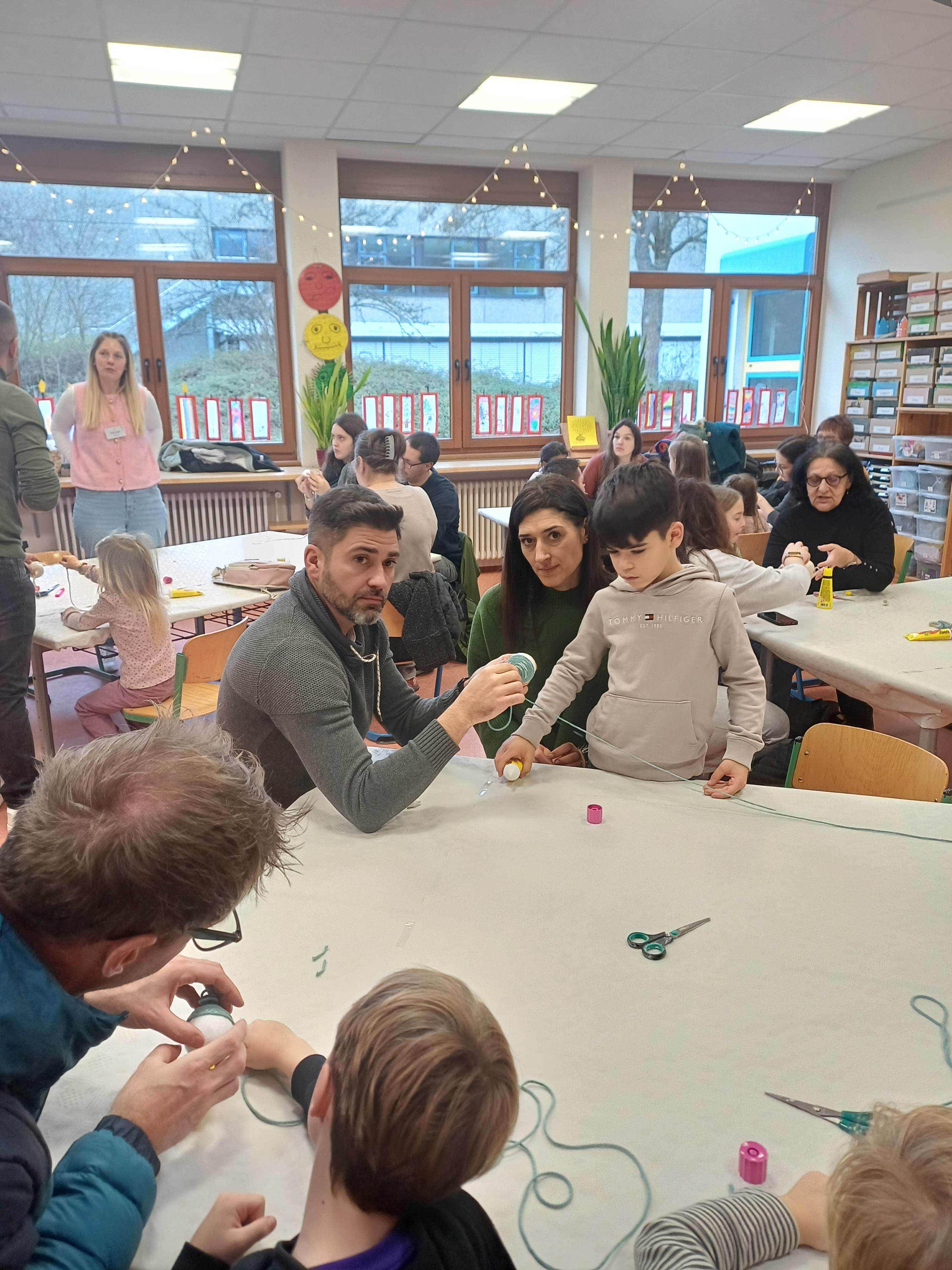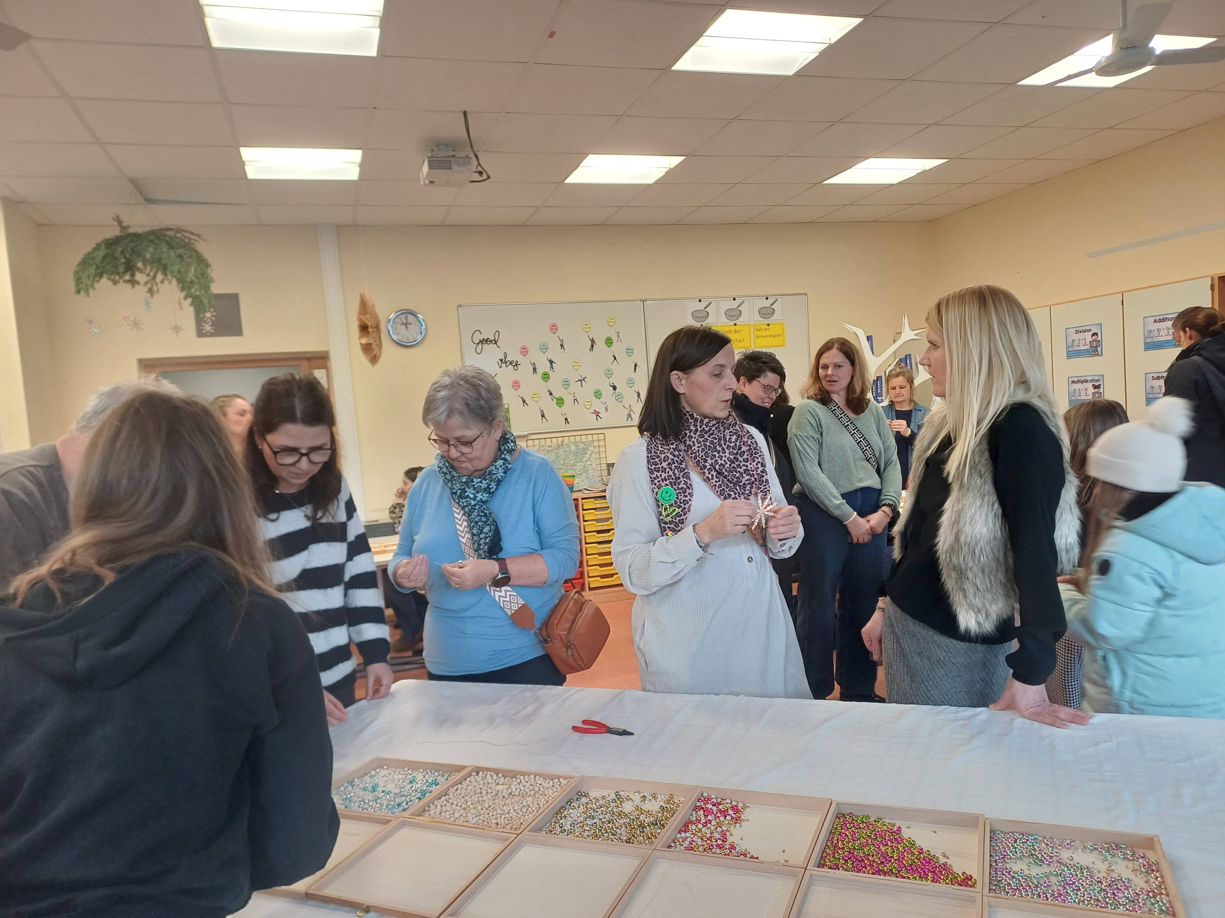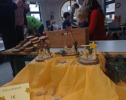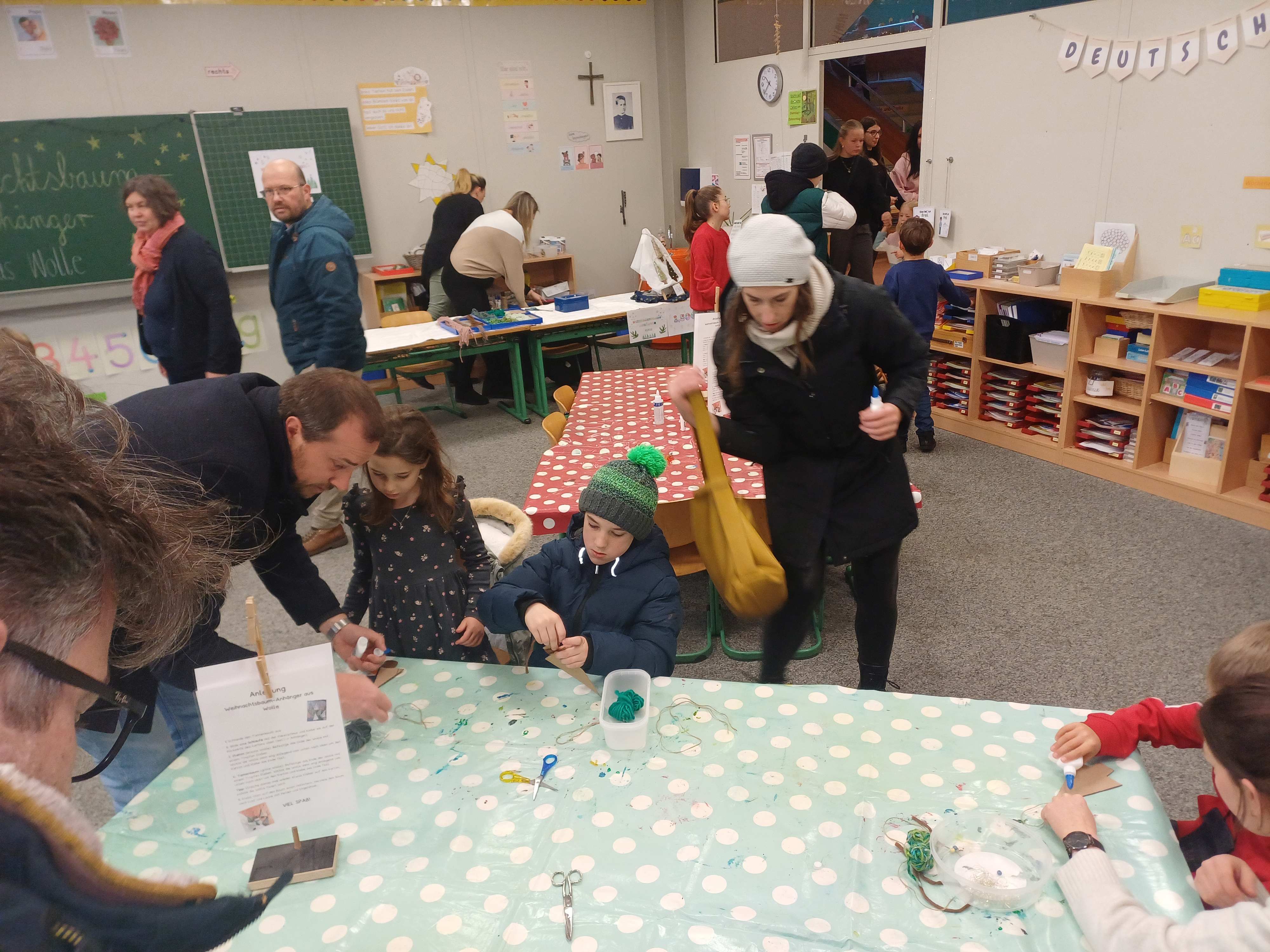 Nach dem Gottesdienst öffneten die Rupert-Mayer-Schule und der Kindergarten die Türen. In den Klassenzimmern der Stufe 1 bis 6 warteten kreative und liebevoll vorbereitete Mitmachangebote: Makramee-Engel, bemalte Glaskugeln, Bienenwachskerzen, Perlensterne, Krippen aus Erdnüssen, Drahttannenbäume, Schneeflocken, Kerzenfärben, selbstgemachtes Badesalz oder bunte Mosaikuntersetzer – Kinder und Erwachsene konnten ihrer Fantasie freien Lauf lassen. Für die Jüngsten gab es Kinderbetreuung, für Leseratten einen Bücherflohmarkt.