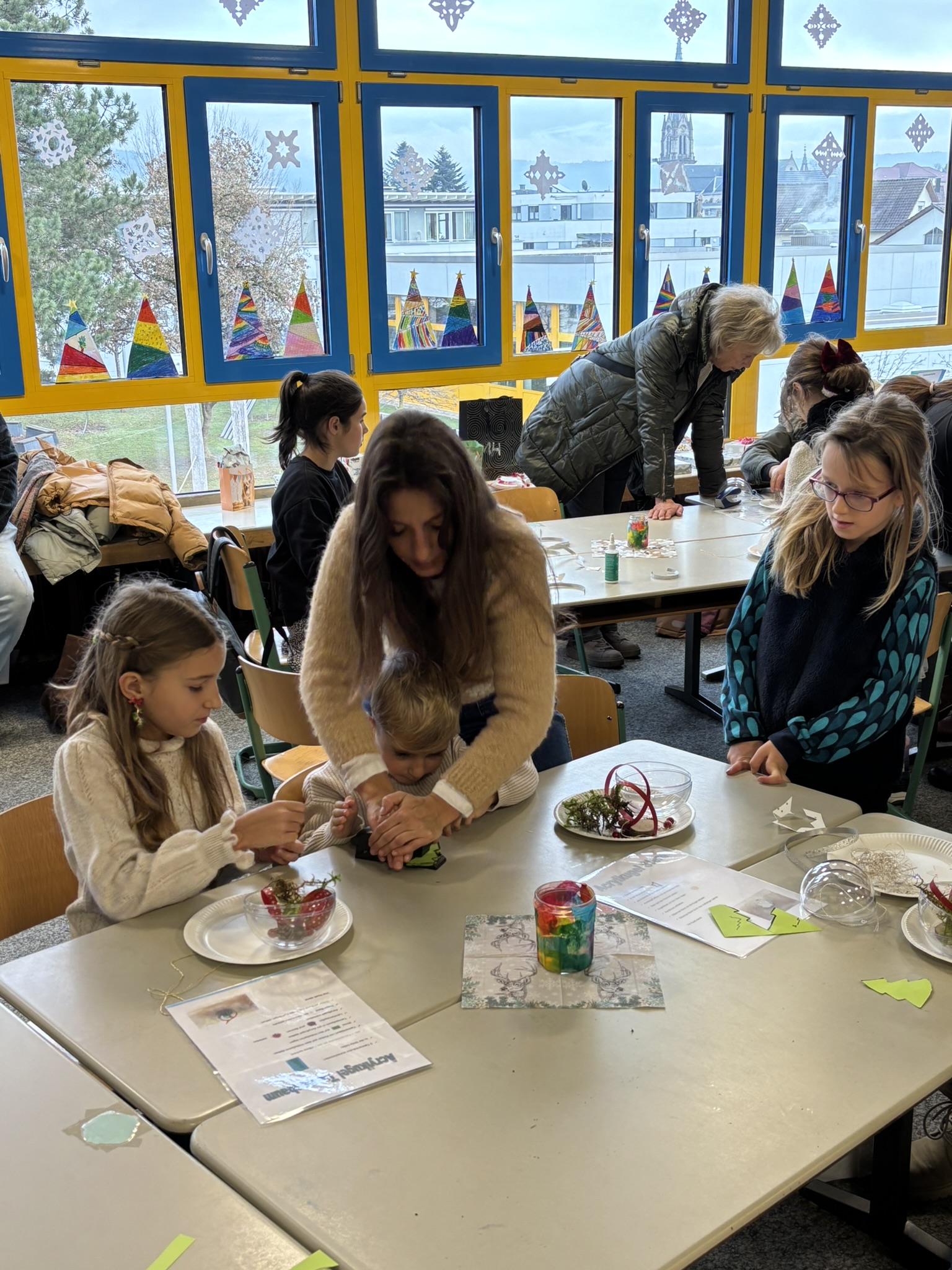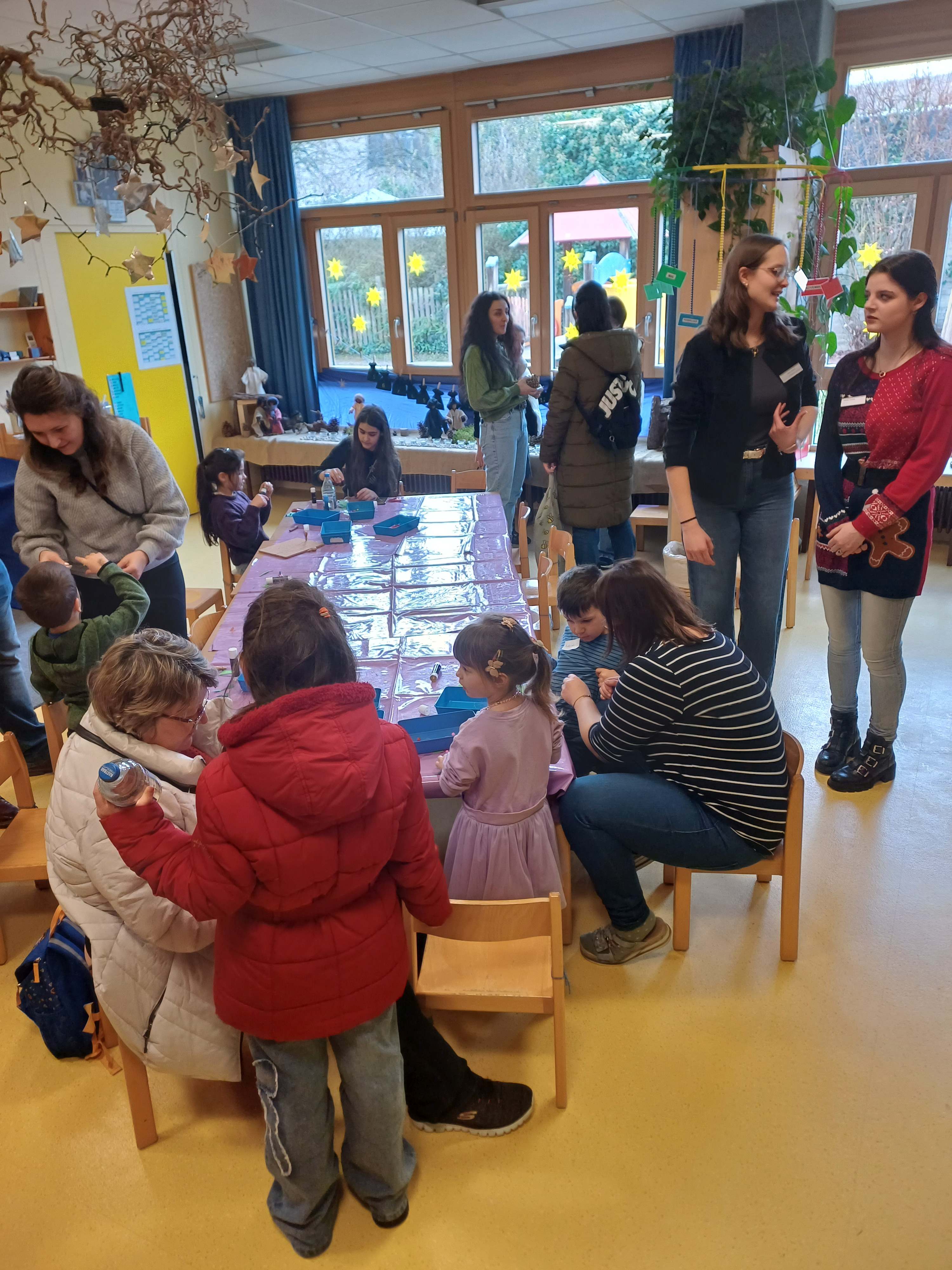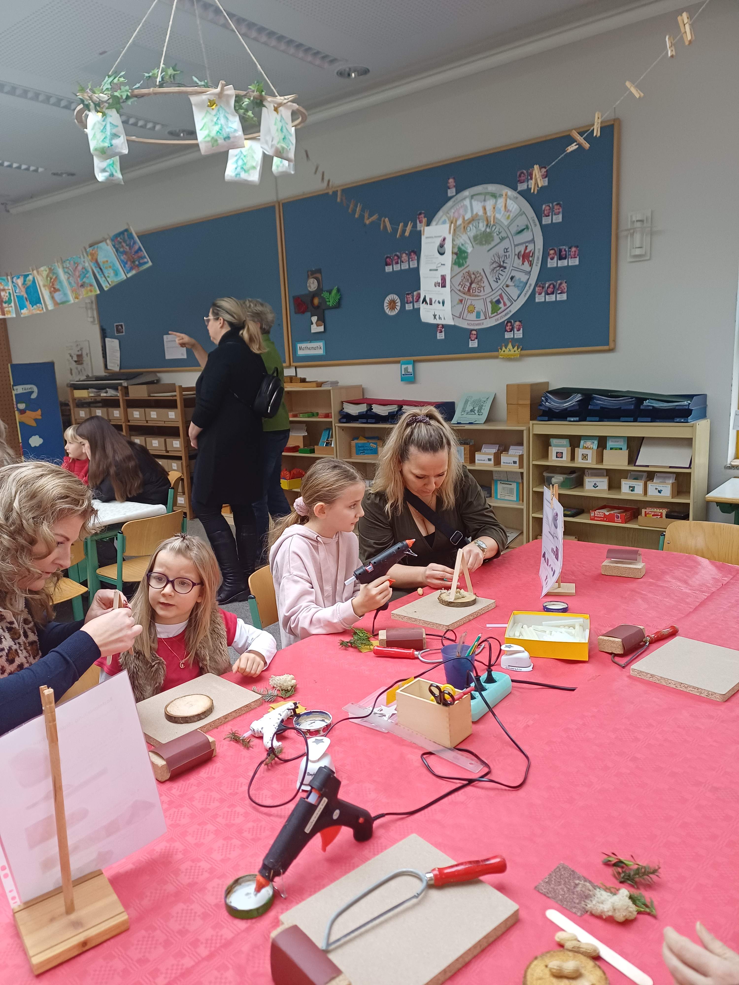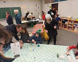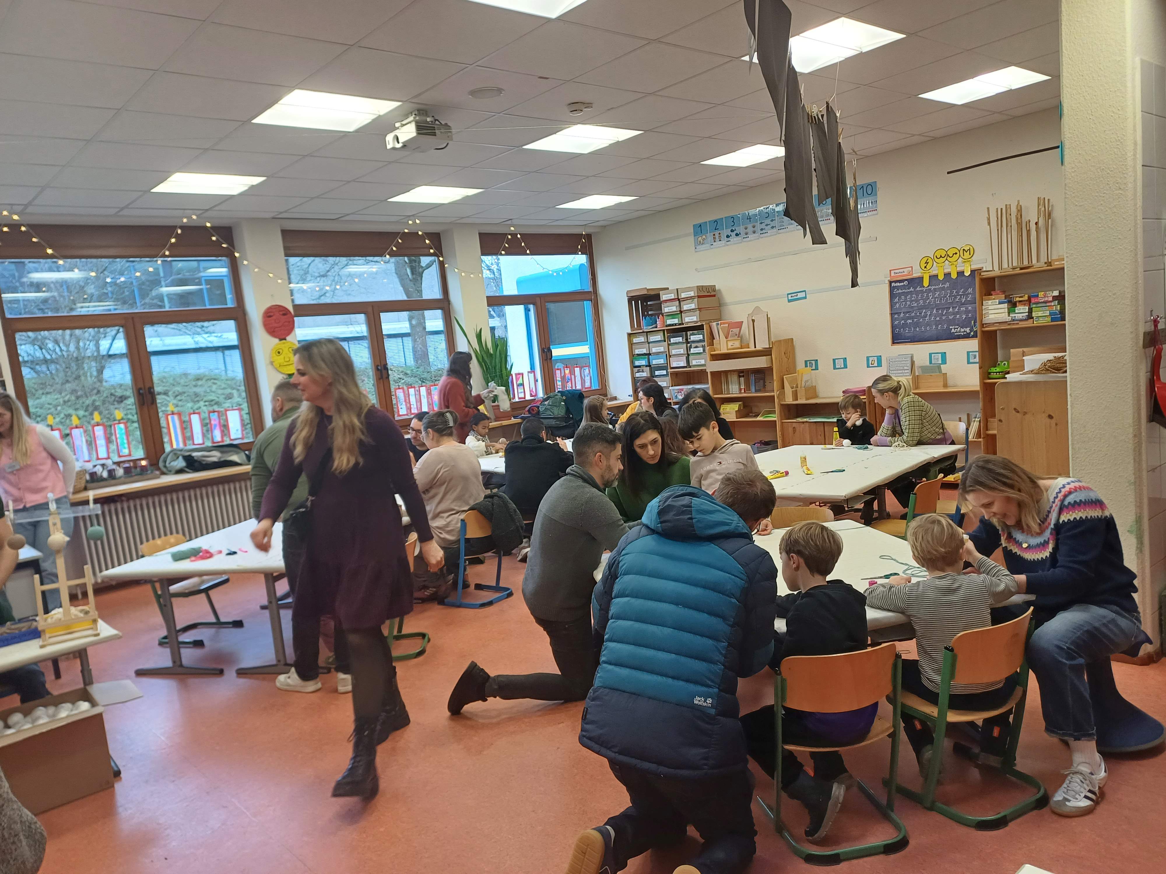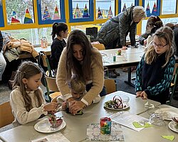 Nach dem Gottesdienst öffneten die Rupert-Mayer-Schule und der Kindergarten die Türen. In den Klassenzimmern der Stufe 1 bis 6 warteten kreative und liebevoll vorbereitete Mitmachangebote: Makramee-Engel, bemalte Glaskugeln, Bienenwachskerzen, Perlensterne, Krippen aus Erdnüssen, Drahttannenbäume, Schneeflocken, Kerzenfärben, selbstgemachtes Badesalz oder bunte Mosaikuntersetzer – Kinder und Erwachsene konnten ihrer Fantasie freien Lauf lassen. Für die Jüngsten gab es Kinderbetreuung, für Leseratten einen Bücherflohmarkt.